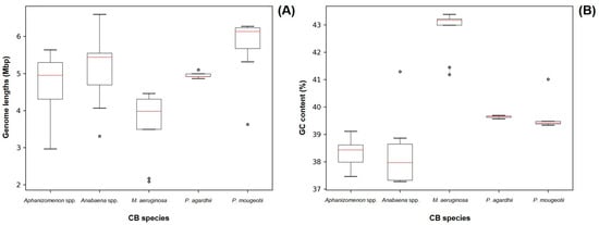Out of the 43 sequenced genomes, it was possible to recover cyanobacteria assemblies from 41 of them. The length and GC content parameters of the recovered cyanobacteria genomes are represented on Figure 2 and are close to the previously reported values for Aphanizomenon spp. (5.187 Mb/37.65%), Anabaena spp. (5.306 Mb/38.38%), Planktothrix agardhii (5.512 Mb/39.50%) and Planktothrix mougeotii (5.499 Mb/39.5%) [43,44,45,46]. For Microcystis spp. samples, the GC base % was close to the available Microcystis aeruginosa reference genome, but the lengths on our assemblies (average 3.648 Mb [±0.917 Mb]) were smaller (5.2 Mb) [47]. This can be related to the lower output of the Illumina Nano flow cell used in the sequencing of our Microcystis spp. strains, as it was not capable of producing reads across the entire length of the cyanobacterial genome.