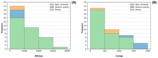 Frequency distribution of the number of contigs (A) and N50 values (B) comprising each of the 41 genomes. Colors indicate genome quality. LMECYA 089 was omitted from the histogram (B) since it presented an outlier value of 195,436 bp for N50.