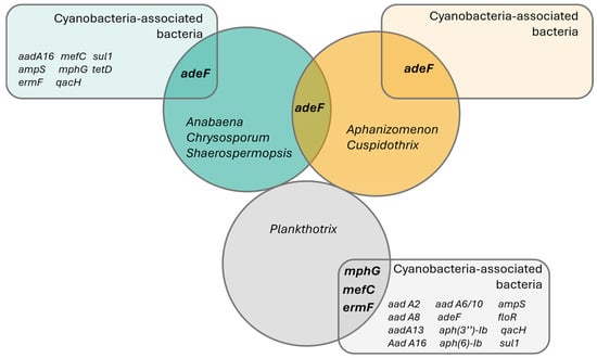 From the 16 genes detected on the assembled freshwater cyanobacteria and bacteria, only 4 were present in the recovered cyanobacteria genomes—adeF-type, mefC-type, mphG-type and ermF-type (Table 1, Figure 5). All ARG hits found on the cyanobacteria genomes appeared on assemblies previously classified as ‘High quality’, according to the criteria defined by Parks et al. [48].
