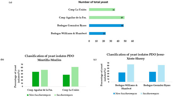 (a) Total number of isolates differentiated by wineries and cooperatives. (b) Number of isolates from each winery, differentiating between the percentage of Saccharomyces and non-Saccharomyces. (c) Number of isolates from each cooperative, differentiating between the percentage of Saccharomyces and non-Saccharomyces.