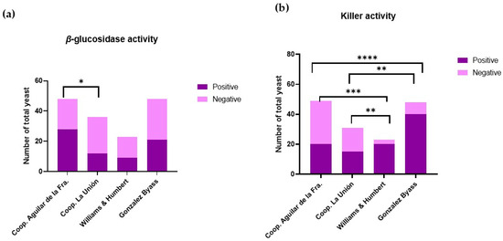 (a) Absence and presence of β-glucosidase activity in Montilla-Moriles yeast (Córdoba, Spain) and POD Jerez–Xérès–Sherry yeast (Cádiz, Spain). (b) Absence and presence of the killer phenotype in Montilla-Moriles yeast (Córdoba, Spain) and POD Jerez–Xérès–Sherry yeast (Cádiz, Spain). Bar plot with significant differences: * means q < 0.05; ** means q < 0.01; *** means q < 0.001; and **** means q < 0.0001.