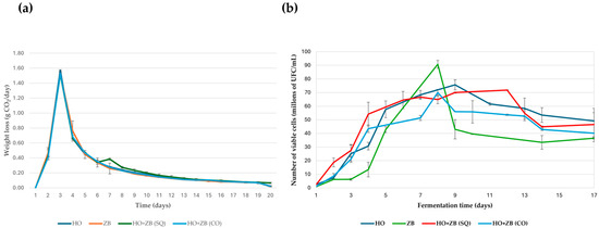 (a) Kinetic profiles of different fermentations performed with Hanseniaspora opuntiae (HO) and Zygosaccharomyces bailii (ZB) in monoculture. In sequential (SQ), where H. opuntiae was added first, and on the fourth day, Z. bailii was introduced and co-cultured (CO). (b) Viable cell count during the different fermentation conditions performed with Hanseniaspora opuntiae (HO) and Zygosaccharomyces bailii (ZB), as described in the previous figure. The means and standard deviations are represented.