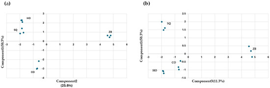 Principal component analysis of the “wines” obtained after fermentations under different conditions: Hanseniaspora opuntiae (HO) and Zygosaccharomyces bailii (ZB) in monoculture. In sequential (SQ), where H. opuntiae was added first, and on the fourth day, Z. bailii was introduced and co-cultured (CO). The analysis was performed on the major volatile compounds. (a) Principal component analysis between components one and two. (b) Principal component analysis between components one and three.