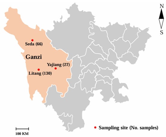 Distribution of three sampling sites (Seda, Yajiang, and Litang) of yak faeces in Ganzi. Red solid circles indicate sampling sites. The number in each bracket refers to the sample size.