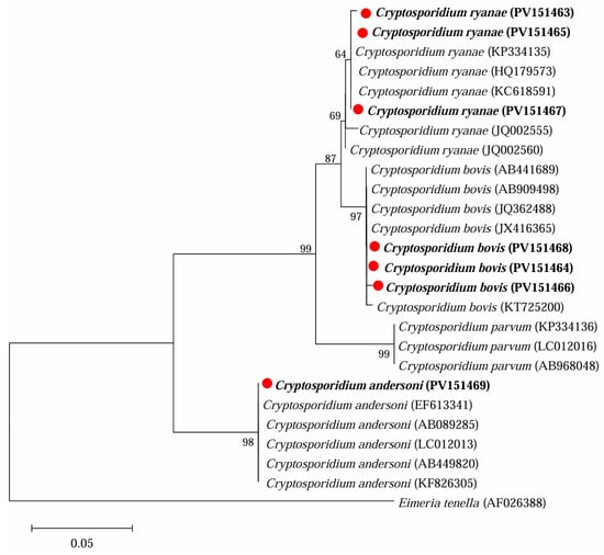 Phylogenetic analysis of representative sequences for the 18S rRNA locus of Cryptosporidium species in this study with referenced sequences, obtained via Maximum Likelihood analysis. The sequences obtained in this study are marked with red solid circles and highlighted in bold font. Eimeria tenella (AF026388) was used as the outgroup; bootstrap values over 50% are indicated.