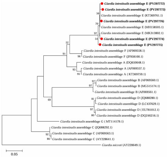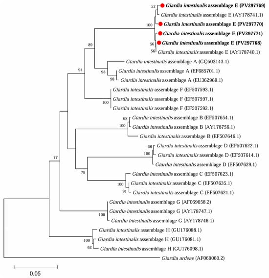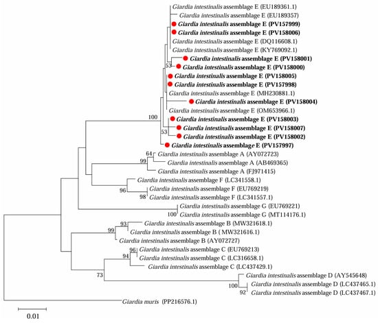 Phylogenetic analysis of representative sequences for the bg locus of G. intestinalis in this study with referenced sequences, obtained using Maximum Likelihood analysis. The sequences obtained in this study are marked with red solid circles and highlighted in bold font. Giardia muris (PP216576.1) was used as the outgroup; bootstrap values over 50% are indicated.