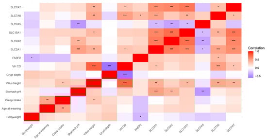 Correlation matrix illustrating Pearson correlations of duodenal nutrient transporter gene expression and physiological parameters. Positive (red) and negative (purple) correlations are represented in color strength on a scale of −1 to 1. * p < 0.05; ** p < 0.01; *** p < 0.001. VH/CD, villus height-to-crypt depth ratio.