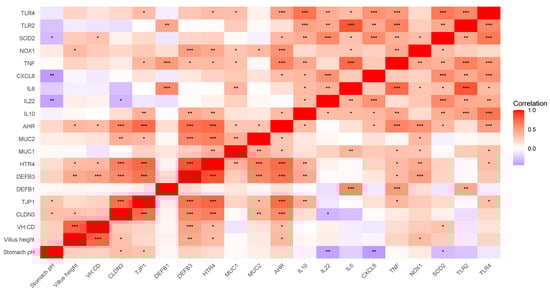 The correlations between duodenal immune response, barrier defense, and serotonin receptor expression and physiological parameters are presented in Figure 3. Both VH and VH/CD were positively correlated with DEFB3, HTR4, and AHR expression. Additionally, VH was positively correlated with CLDN3 and NOX1, while VH/CD was positively correlated with SOD2. Surprisingly, stomach pH was positively correlated with tight-junction proteins TJP1 and CLDN3 but negatively correlated with the expression of CXCL8, IL22, and SOD2. There were several notable correlations among genes. Specifically, the beta-defensin genes DEFB1 and DEFB3 exhibited distinct co-expression patterns. DEFB1 was positively correlated with TLR2, IL6, and TNF expression, whereas DEFB3 was positively correlated with VH, VH/CD, tight junction proteins, TJP1 and CLDN3, HTR4, and MUC2, among others. In addition to their positive correlations with VH and VH/CD, AHR and HTR4 were positively correlated to each other and several immune-related genes: CLDN3, TJP1, DEFB3, MUC1, and MUC2. Additionally, AHR was positively correlated to CXCL8, SOD2, and TLR4 expression.