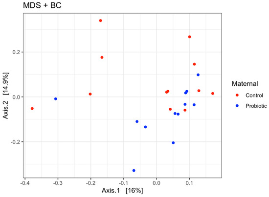 The effects of probiotic supplementation on the measures of beta diversity and alpha diversity in the sow feces on day 114 of gestation are presented in Figure 4 and Table 10, respectively. There was a difference in beta diversity between the control and probiotic sow feces based on a PERMANOVA analysis of Bray–Curtis dissimilarity (p < 0.05). However, probiotic supplementation had no effect on the Observed, Chao1, Shannon, Simpson, InvSimpson, or Fisher index measures of alpha diversity in the sow feces (p > 0.05).