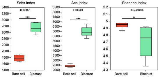 Comparison of richness and diversity of AAPB community in the biocrust and bare soil samples. The boxplot demonstrates the α-diversity parameters, Sobs index, Ace index, and Shannon index. Boxes limit the 25th and 75th percentile with the median presented as line inside. Error bars present the 1st and 99th percentile. Significant differences: *** p ˂ 0.001, * p ˂ 0.05.