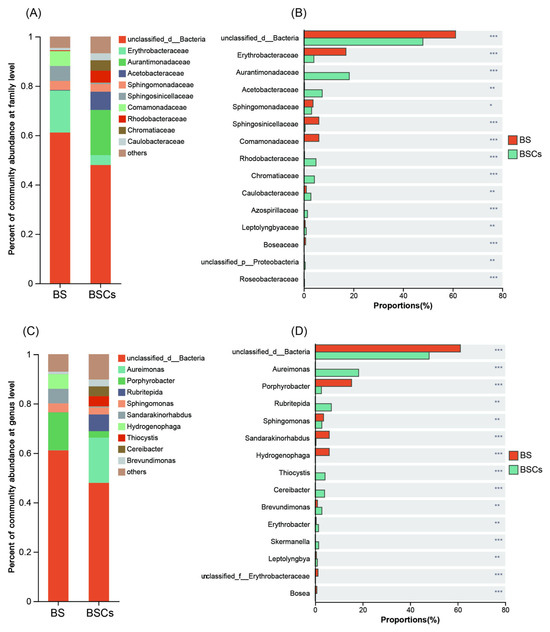 Analysis of differences of microbial composition between the bare soil and biocrust. (A) Relative abundance of the major AAPB taxa at family level; (B) difference analysis of dominant taxa at family level; (C) relative abundance of the major AAPB taxa at genus level; (D) difference analysis of dominant taxa at genus level. Based on amplicon 16S rRNA gene data. Significant differences: *** p < 0.001, ** p < 0.01, * p < 0.05. Abbreviations: bare soil (BS), biocrusts (BSCs), and aerobic anoxygenic photosynthetic bacteria (AAPB).