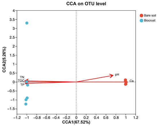 Differential analysis of AAPB community composition among various sample groups was conducted using PERMANOVA. We discovered significant differences in the composition of AAPB communities between the biocrusts and the bare soil. Through canonical correlation analysis, we found that AAPB composition was highly correlated to the soil properties, including TOC, TN, TP, pH, and Ca contents (Figure 3).
