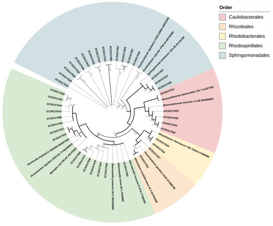 A bacterial genome DNA extraction kit (DP302, Tiangen, Beijing, China) was employed to extract bacterial genomic DNA. Meanwhile, the universal bacterial primers 27F (AGAGTTTGATCCTGGCTCAG) and 1492R (GGTTACCTTGTTACGACTT) were employed to amplify the bacterial 16S rRNA gene. The AAPB biomarker gene pufLM was amplified using primers 67F (TTCGACTTYTGGRTNGGNCC) and 781R (CCAKSGTCCAGCGCCAGAANA) and then sequenced. The 16S rRNA gene sequences obtained from Sanger sequencing were compared online through the EzBioCloud Website to determine the closely related species of the isolated strain. According to the results of the 16S rRNA gene sequence alignment, the 16S rRNA gene sequence of the isolated strain with the highest similarity was used as a reference, and the Clustal W method in the MEGA-X software was used for multiple sequence alignment [38]. The aligned results underwent model prediction, with the best-fit model being Tamura–Nei (TN93). The neighbor-joining method was employed for clustering analysis to construct a phylogenetic tree [39]. The tree was bootstrapped 1000 times, and visualization was enhanced using the iTOL website [40].