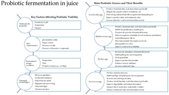 Diagram showing key factors affecting probiotic viability and the main probiotic genera used and their benefits. Emerging technologies can be applied in probiotic juice fermentation.