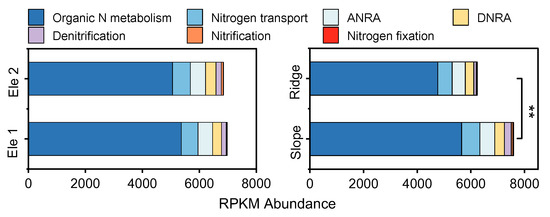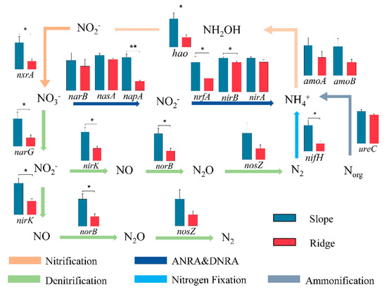 The differences in key genes in the process of the nitrogen cycle between topographic gradients. “*” represents significance (p < 0.05), “**” represents significance (p < 0.01).