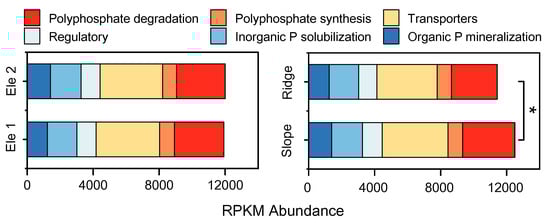 The abundance of P metabolic functional genes showed no significant variation across elevational gradients; however, slope habitats exhibited significantly higher abundances compared to ridge habitats. Overall, genes associated with polyphosphate synthesis, phosphorus transport, inorganic phosphate solubilization, and organic phosphorus mineralization displayed higher abundances across both topographic and elevational gradients within the phosphorus metabolic functional gene pool (Figure 2).