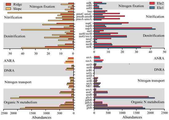 A comparative analysis was conducted on the abundance, composition, and variations in N and phosphorus P metabolic functional genes in the rhizosphere of P. tabuliformis populations across different habitats. The results revealed that the abundance of nitrogen metabolic functional genes in slope habitats was significantly higher than that in ridge habitats (p > 0.05), and abundance in low-elevation habitats (Ele1) was higher than that in high-elevation habitats (Ele2), but did not reach the significance level. Across both topographic and elevational gradients, genes associated with organic nitrogen metabolism exhibited higher abundance, whereas those linked to the nitrogen fixation, nitrification, and denitrification processes showed lower abundance (Figure 1).
