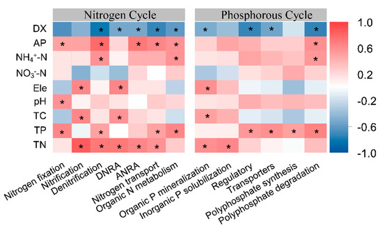 The correlation between the function of the nitrogen and phosphorus cycle genes and environmental factors. “*” represents significance (p < 0.05).