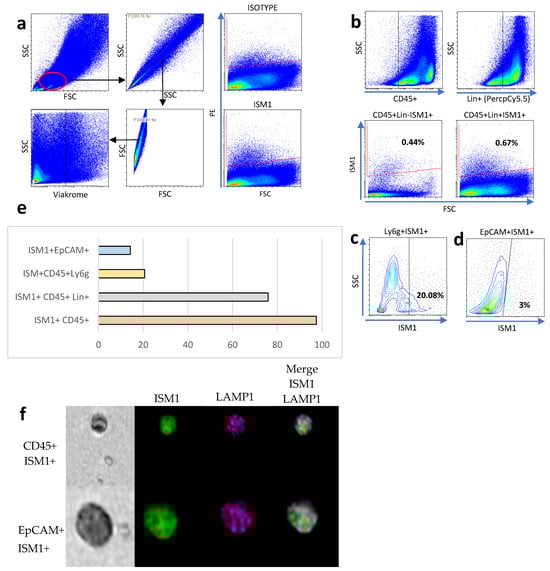 To establish the lymphogate region (Figure 1a), singlets were selected using complexity parameters (SSC-A on the Y-axis and SSC-H on the X-axis) and size parameters (FSC-A on the Y-axis and FSC-H on the X-axis). Viable cells were selected using the negative region of the Viakrome dye (Figure 1a, bottom). To better characterize ISM1+ cells, we performed flow cytometry analysis on small intestine cells, and we found around 0.7% of ISM1-producing cells. Due to the high variability in small intestine cells, we decided to measure ISM1 expression in CD45+, CD45+Lin+ cells, the latter included antibodies coupled to PercPCy5.5 against CD19, TER119, CD8a, NK1.1, CD3e, Ly6G, and CD11b (Lin+ cells); interestingly we found that most of ISM1+ cells were CD45+Lin+ compared to CD45+Lin- cells (Figure 1b,e). Interestingly, we found that a high frequency of myeloid cells expressing Ly6G also expressed ISM1 (Figure 1c). Furthermore, we also found that epithelial Epcam+ cells expressed ISM1, which was the least representative ISM1-expressing population (Figure 1e). Finally, we were able to detect ISM1+ cells by flow microscopy. In Figure 1f, CD45+ and EpCAM+ cells expressing ISM1 are depicted together with the intracellular marker Lamp1.