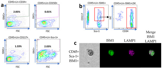 We previously observed a subset of hematopoietic stem-like cells expressing ISM1 in the lung [11], and it was recently observed that the human small intestine harbors a subset of CD34+ hematopoietic stem cells [9]. Therefore, we decided to investigate whether hematopoietic stem-like cells could express ISM1. First, we searched for ISM1 expression in CD45+Lin- cells together with the individual expression of CD34, c-kit (CD117), Sca-1, and CD150, and we found a small fraction of CD45+Lin- cells expressing CD34, c-kit, or Sca-1; we also detected a very small fraction of CD45+Lin-CD150I+SM1+ cells (Figure 2a), suggesting that some ISM1+ cells may have a immunophenotype of hematopoietic stem cells. Furthermore, we looked for the presence of Sca-1 and c-kit expression to obtain a fraction of cells we called ISM1+LSK (CD45+Lin- ISM1+ c-kit+ Sca-1+); importantly the majority of the ISM1+LSK+ cells also expressed CD34 (Figure 2b), indicating that, in the small intestine, there is a fraction of ISM1 hematopoietic stem-like cells. Finally, we confirmed the co-expression of CD45, Sca-1, and ISM1 by ImageStream in single cells (Figure 2c).