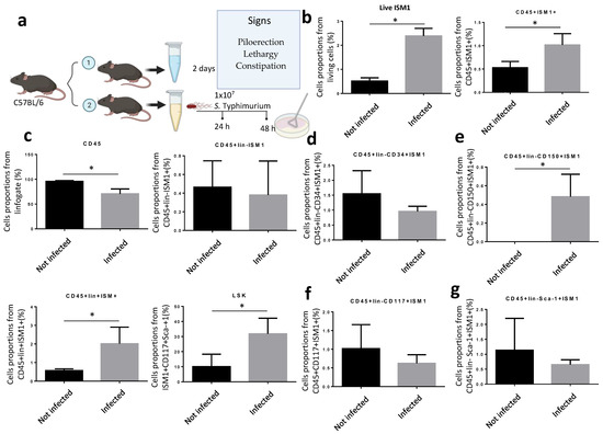 Since ISM1 expression changed during inflammatory processes involving chronic diseases but also during pathogenic challenges [9,17], we decided to investigate whether ISM1 expression in the small intestine is perturbed during infection. Thus, we orogastrically infected C57BL/6 with S. Thyphimurium during 48 h (Figure 3a). Mice were sacrificed after 48 post-infection, and intraluminal contents and cells were collected. We found that the percentage of total intestinal cells expressing ISM1 increased significantly compared to uninfected mice (Figure 3b). Therefore, we analyzed different ISM1+ cell subsets. We found that the fraction of CD45+ISM1+ cells increased significantly during infection (Figure 3b) and, importantly, ISM1+LSK cells were also significantly increased (Figure 3c), suggesting that the fraction of hematopoietic stem-like cells expressing ISM1 was perturbed during infection. We also examined the impact of infection on subpopulations of cells with a hematopoietic stem-like phenotype that expressed ISM1 by analyzing different progenitor cell markers. The results showed that the CD45+Lin-CD34+ISM1+ population tended to decrease during infection (Figure 3d), while the CD45+Lin-CD150+ISM1+ populations significantly increased during infection (Figure 3e). The CD45+Lin-CD117+ISM1+ and CD45+Lin-Sca-1+ISM1+ populations did not show statistically significant changes (Figure 3f,g). These findings suggest that Salmonella infection specifically affects the CD45+Lin-CD150+ISM1+ cell population, and likely the CD45+Lin-CD34+ISM1+ population as well, which could have implications for hematopoiesis during the immune response.