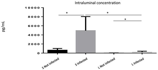 ISM1 levels in the intraluminal contents of the intestine during Salmonella Typhimurium infection. Quantification of ISM1 levels in the intraluminal content of the small (S) and large (L) intestines of uninfected and S. Typhimurium-infected mice at 48 h post-infection. Data represent the mean ± standard deviation of at least three independent experiments. * p < 0.05.