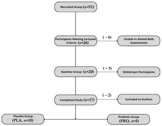 The interventions were well-tolerated, with no adverse effects reported, and the probiotic product adhered to safety certifications. From an initial pool of 51 volunteers, 26 female participants met the inclusion criteria. However, only twenty attended the blood and stool sample collection, and three subsequently failed to collect the study supplement, providing no explanation for their absence. Seventeen female dancers completed the study; however, one participant was excluded during the statistical analysis due to an outlier body mass index (BMI) indicative of overweight status, significantly differing from other group members. This exclusion ensured sample homogeneity and the validity of the results, as BMI is a potential confounding factor in probiotic health studies. Sixteen participants proceeded to the final analysis, with eleven receiving the placebo (PLA) and five receiving the probiotic (PRO) treatment. During the preliminary statistical analysis of the primary outcome, anandamide (AEA) levels, an additional outlier was identified. One data point exhibited a substantial deviation from the overall distribution, resulting in the final group having 15 participants. We conducted our analysis on a per-protocol basis, including only those participants who completed the trial (N = 15). To monitor adherence to the probiotic/placebo regimen, participants were asked to maintain daily logs of their capsule intake and return all the unused capsules at their follow-up visit. Compliance was verified by counting the returned capsules. Adherence to the intervention was 100%, with participants consuming the doses corresponding to the full 12-week period (84 days).