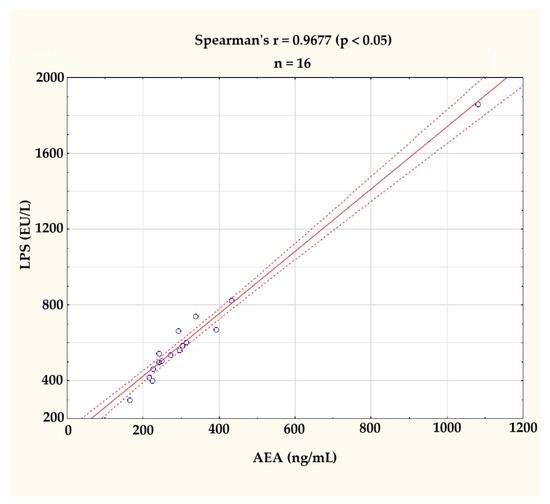 In accordance with the expectations derived from the literature review available on the discussion, the levels of AEA and LPS were found to be correlated (r = 0.9677; p < 0.05), as assessed by Spearman’s rank-order correlation. This correlation is illustrated in Figure 2. The clearly visible outlier on the graph was excluded from further analyses.