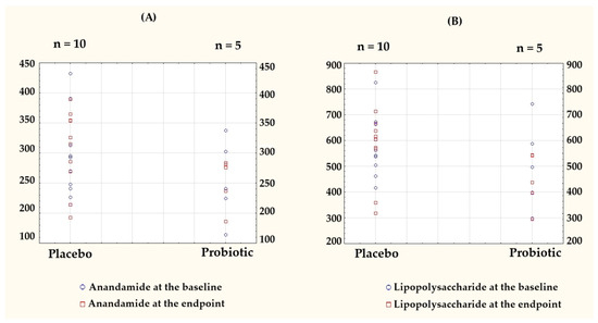 Individual-level data presented as column scatter plots to illustrate the baseline and endpoint values for (A) anandamide (AEA) and (B) lipopolysaccharide (LPS) in the placebo (n = 10) and probiotic (n = 5) groups. Each dot represents a single participant, plotted separately for each group to visualize the within-group distributions and changes over time. Baseline values are marked with blue circles, endpoint values with red squares.