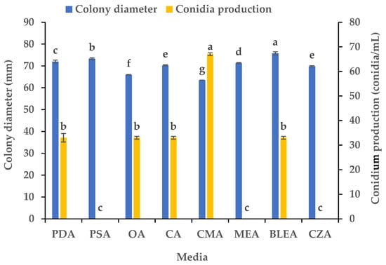 Effects of culture media on the mycelial growth and sporulation of Bipolaris oryzae FSBO2. PDA, potato dextrose agar; PSA, potato sucrose agar; OA, oatmeal agar; CA, carrot agar; CMA, cornmeal agar; MEA, malt extract agar; BLEA, banana leaf extract agar; CZA, Czapek’s agar. Different lowercase letters (a, b, c, d, e, f, g) indicate significant differences (p < 0.05) according to ANOVA. Data are presented as the mean ± SE (n = 3).