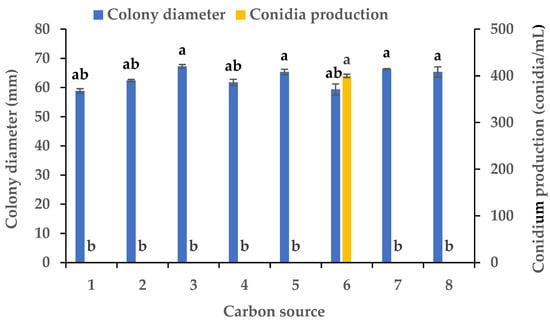 Effects of carbon sources on the mycelial growth and sporulation of Bipolaris oryzae FSBO2: 1, fructose; 2, soluble starch; 3, sucrose; 4, maltose; 5, mannitol; 6, lactose; 7, sorbitol; 8, glucose. Different lowercase letters (a, b) indicate significant differences (p < 0.05) according to ANOVA. Data are presented as the mean ± SE (n = 3).