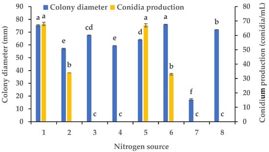 Effects of nitrogen sources on the mycelial growth and sporulation of Bipolaris oryzae FSBO2: 1, beef extract; 2, (NH4)2HPO4; 3, NaNO3; 4, NH4Cl; 5, (NH4)2SO4; 6, yeast extract; 7, urea; 8, tryptone. Different lowercase letters (a, b, c, d, e, f) indicate significant differences (p < 0.05) according to ANOVA. Data are presented as the mean ± SE (n = 3).