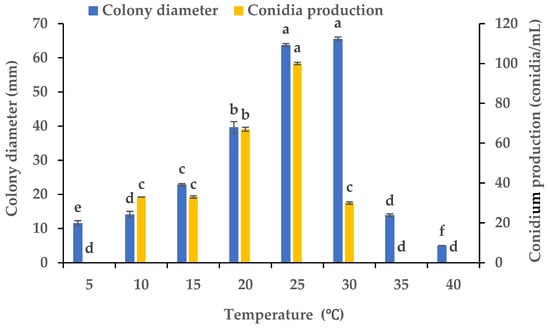 Effects of temperature on the mycelial growth and sporulation of Bipolaris oryzae FSBO2. Different lowercase letters (a, b, c, d, e, f) indicate significant differences (p < 0.05) according to ANOVA. Data are presented as the mean ± SE (n = 3).