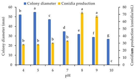 Effects of pH on the mycelial growth and sporulation of Bipolaris oryzae FSBO2. Different lowercase letters (a, b, c, d, e, f, g) indicate significant differences (p < 0.05) according to ANOVA. Data are presented as the mean ± SE (n = 3).