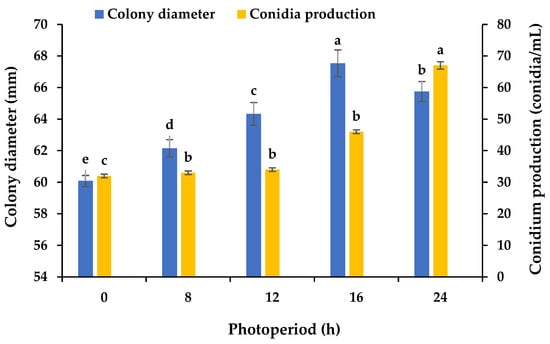 Effects of photoperiod on the mycelial growth and sporulation of Bipolaris oryzae FSBO2. 0 h, 24 h dark; 8 h, 8 h light/16 h dark; 12 h, 12 h light/12 h dark; 16 h, 16 h light/8 h dark; 24 h, 24 h light. Different lowercase letters (a, b, c, d, e) indicate significant differences (p < 0.05) according to ANOVA. Data are presented as the mean ± SE (n = 3).