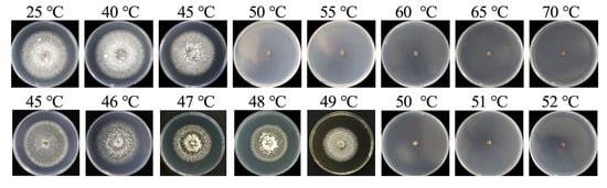 Through incubation in water baths at varying temperatures, we determined the mycelial lethal temperature for B. oryzae from banana plants affected by leaf spot. The results indicated that mycelial plugs could grow and form colonies when soaked in water at temperatures ranging from 25 °C to 45 °C for 10 min (Figure 7). They did not grow when exposed to temperatures of 50 °C and above. To further refine the precision of the temperature threshold, the gradient was narrowed to 1 °C between 45 °C and 52 °C and the tests were repeated, revealing that the fungal mycelial plugs could not grow normally after being soaked in water at between 50 °C and 52 °C for 10 min (Figure 7); this indicated that the lethal temperature for the fungus was 50 °C with a 10 min exposure.