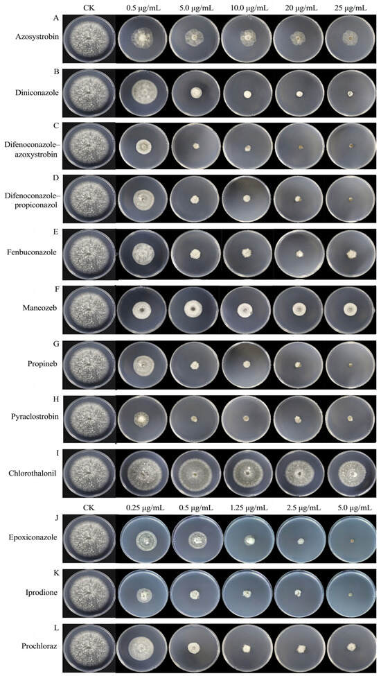 Effects of 12 fungicides on the mycelial growth of B. oryzae FSBO2. (A–I) Final concentration of nine fungicides (0.5 μg/mL, 5.0 μg/mL,10.0 μg/mL, 20 μg/mL, and 25 μg/mL). (J–L) Final concentration of three fungicides (0.25 μg/mL, 0.5 μg/mL, 1.25 μg/mL, 2.5 μg/mL, and 5.0 μg/mL). CK represents PDA plates without fungicides.