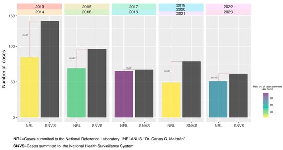 Comparation of cases summited to the NRL (National Reference Laboratory, INEI—ANLIS “Dr. Carlos G. Malbrán”) and to the SNVS. The plot represents isolates from individuals under 5 years old, as these are the data presented in SNVS. The number of cases reported to the SNVS was extracted from the Argentine National Epidemiological Bulletin (https://www.argentina.gob.ar/boletin-epidemiologico-nacional), last accessed on 11 September 2024.