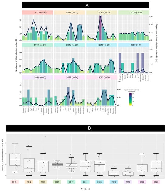 The plot and boxplot depicted in Figure 2A,B highlight the variations in isolate dates across different months over several years. Again, the submission of isolates was impacted by the SARS-CoV-2 pandemic, resulting in fluctuations in the proportion of isolates.