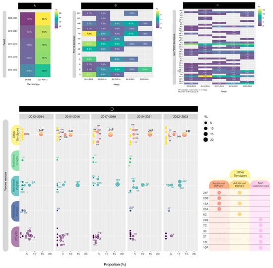 To delineate serotype categories, cases were organized based on the serotypes covered by various pneumococcal conjugate vaccines (PCVs). Specifically, the categorization included serotypes encompassed in PCV13 (1, 3, 4, 5, 6A, 6B, 7F, 9V, 14, 18C, 19A, 19F, and 23F), PCV15 (augmenting PCV13 with 22F and 33F) [17], PCV20 (extending PCV15 with 8, 10A, 11A, 12F, and 15B/C) [18], PCV24 (further including 2, 9N, 17F, and 20 to PCV20) [19,20]. Serotypes 15B and 15C were grouped as 15B/C due to their potential interchangeability arising from a slipped strand mispairing of a tandem thymine–adenine repeat [21]. Any serotypes not covered by the specified vaccines were classified as non-vaccine-type serotypes. We calculated the theoretical vaccine coverage by adding the proportion of each serotype included in each PCV for the first and last period.