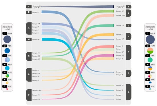 In Figure 4, a comparison between the serotype rankings in 2013–2014 and 2022–2023 is illustrated. Serotypes with values equal to or greater than 2% were included in the plot. Notably, serogroup 24 has consistently maintained the position as the most prevalent throughout the observed periods. Conversely, certain serotypes, such as serotypes 1, 5, 6B, and 33F, have witnessed a significant decline in circulation. However, several other serotypes persisted among the top-rated, exemplified by serotype 3 emerging as the most predominant, with serotypes 7F and 14 following, albeit in lesser proportions.