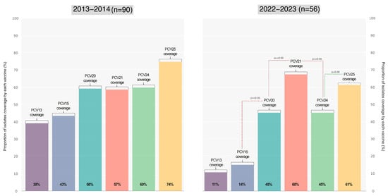 PCV theoretical coverage. Considering the period of 2022–2023, our analysis revealed no statistically significant differences between PCV13 vs. PCV15, PCV20 vs. PCV24, or PCV21 vs. PCV25. Of the currently available vaccines, PCV20 achieved the highest theoretical vaccination coverage of 45% in the most recent period.