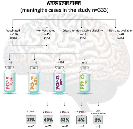 Between January 2013 and December 2023, a total of 1613 isolates from invasive pneumococcal disease in children under 6 years of age were summited to the National Reference Laboratory, INEI—ANLIS “Dr. Carlos G. Malbrán”. Of these isolates, 333—representing 20.6% of the total—were obtained from meningitis cases.