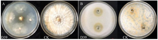Primary and secondary screening effects of strain D39. (A) A mycelial plug of C. parasitica was placed at the center of a PDA plate, and the strain D39 was inoculated at 2.50 cm from the disk in a direction perpendicular to it; CK: a 5 mm mycelial plug of C. parasitica, was used as the blank control. (B) C. parasitica spore suspension was added to PDA and thoroughly mixed. Then, 200 μL of sterile fermentation broth from strain D39 was placed into Oxford cups containing distilled water serving as the blank control.