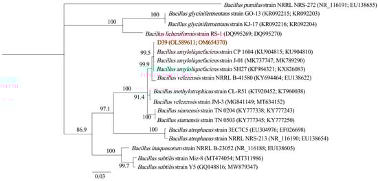 Strain D39 formed opaque, milky-white colonies on LB agar. The colonies were circular with irregular edges and a raised center (Figure S1A,B). Strain D39 was identified as a Gram–positive, spore-forming bacterium. The strain demonstrated proficiency in hydrolyzing starch and reducing nitrate, producing positive results in the gelatin liquefaction, Voges–Proskauer reaction, and catalase tests; however, negative results were observed in the methyl red test, phenylalanine deaminase test, and citrate utilization test (Table 2 and Figure S1C–L). In accordance with its morphological characteristics and physiological and biochemical properties, strain D39 was preliminarily identified as Bacillus spp.