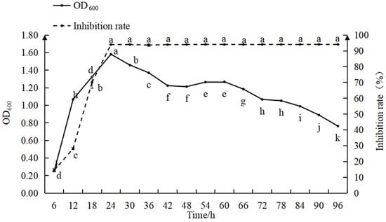 During the 0–12 h period, the bacterial count increased rapidly and the nutrients in the culture medium were primarily used for the increase in bacterial numbers, resulting in the low production of antimicrobial substances and, consequently, a low inhibition rate (p < 0.05). From 12 to 24 h, as as bacterial growth slowed, nutrients were increasingly directed toward the synthesis of antimicrobial substances, leading to a rapid increase in the inhibition rate. When the bacterial count reached its peak, the production of antimicrobial substances accelerated, bringing the inhibition rate close to 100%. During the 24–96 h period, though the bacterial count gradually decreased, the culture medium still contained a high concentration of antimicrobial substances, allowing the inhibition rate to remain at its maximum of 100%. These observations suggest that prior to peak bacterial density, the antimicrobial effect is influenced by both the number of antagonistic bacteria and the concentration of antimicrobial substances; after the bacterial population peaks, the antimicrobial effect is primarily dependent on the concentration of antimicrobial substances.