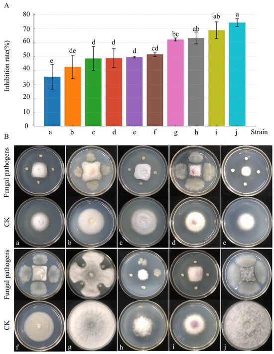 Antimicrobial spectrum of strain D39. (A) Histogram of the inhibitory effect of strain D39 on pathogenic fungi a–j. Different lowercase letters denote significant differences among treatments (Waller–Duncan test, p < 0.05). (B) Representative images of the inhibition effect of strain D39 on pathogenic fungi a–j. Pathogenic fungi a–j are, respectively: F. solani, F. tricinctum, P. capsici, F. fujikuroi, A. phaeospermum, F. incarnatum–equiseti species complex, B. dothidea, A. rasikravindrii, F. oxysporum, and N. parvum.