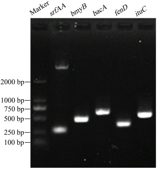 PCR amplification was performed using five pairs of specific primers, and the products were examined by agarose gel electrophoresis, with all five primer pairs producing target bands (Figure 5). BLAST analysis revealed that the sequences of srfAA, bmyB, bacA, fenD, and ituC amplified from B. amyloliquefaciens D39 had nucleotide identities of 95.57%, 98.5%, 100%, 99.12%, and 98.95%, respectively, with corresponding genes in other Bacillus species. The gene fragment sizes were 177, 340, 461, 242, and 396 bp, respectively (Table 3), which are close to the sizes reported previously [44]. The genes srfAA, ituC, fenD, bmyB, and bacA were successfully amplified from strain D39, are involved in the biosynthesis of the antimicrobial compounds surfactin, iturin, fengycin, bacillomycin, and bacilysin, respectively, indicate the strong antimicrobial potential of B. amyloliquefaciens D39.