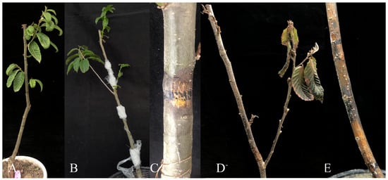 Control effect of B. amyloliquefaciens D39 fermentation broth on chestnut blight. (A) Healthy plants; (B,C) plants inoculated with the fermentation broth of strain D39; (D,E) control plants inoculated with distilled water.