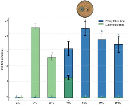 The antimicrobial effects of the precipitates and supernatants obtained after ammonium sulfate fractionation at different saturation levels showed significant differences (p < 0.05). As the solution saturation increased, the antimicrobial effect of the precipitate initially intensified, reaching a peak inhibition zone diameter of 21.63 mm at 60% saturation, before subsequently declining (Figure 7). In contrast, the antimicrobial effect of the supernatant diminished as saturation increased, with no antimicrobial activity detected at 60% saturation or above.